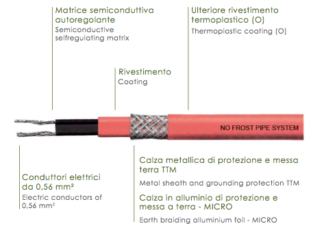 NO FROST PIPE SYSTEM SELF-REGULATING – TTM/MICRO: a semiconductive matrix cablewhich can be cut to length, spliced and derived, it does not produce dangerous overheating even if it overlapped, it produces a power which decreases with indreasing outer temperature. This system is the ideal solution to solve the problem of water freezing in the pipes, in watery solutions, fuel oil and other liquids.